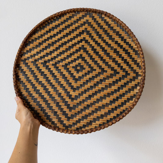 Vintage Flat Round Woven Cane Drying Basket with Black and Auburn Coloring